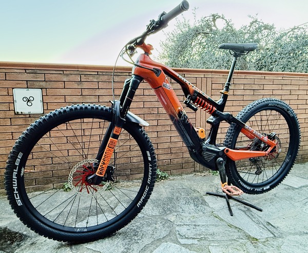 Splendida e-bike da enduro, marca Rotwild Tedesca modello RX750 dell’Ottobre 2021, perfettamente funzionante. Taglia M, Mullet (29/27,5”) per altezze da 1.68 fino a 1.80. E-MTB Top di Gamma, ottima anche per all-mountain, escursioni generose, geometrie azzeccate, maneggevole su tornantini stretti e tratti ripidi. Motore Brose S-Mag da 90Nm (legale a 25kmh e 250W rating power) silenziosissimo e configurabile tramite app, capiente batteria da 750 Wh per dislivelli importanti sfiorando 3000 d+. Telaio full carbon areografato a mano da Artista a tema Ghost Rider personalizzato e unico pezzo. Montaggio degno di nota con diversi componenti NUOVI quali: freni Shimano e pastiglie, coppia dischi da 203mm, cerchi e ruote complete Wag, gomme Schwalbe Magic Mary e Nobby Nic, manopole Phantom e sella AiYing Cycling Confort. Gli altri componenti usati, perf. funzionanti e revisionati sospensioni di tutto rispetto: forca Rockshok Yari da 160 mm con Slik Graphics in tinta (Upgradabile con Zeb o Fox da 38mm), ammo RS Super Deluxe a Molla, telescopico RS Reverb Stealth 150mm. Ruote nastrate, latticizzate e Toublessizzate. La bici ha percorso solo 2553km, in ottimo stato di conservazione, presenta pochi classici segni di usura di chi va per sentieri: in particolare segni e scalfitture dovuti a pietrate e sfregamenti nelle parti basse del carro posteriore. Sempre shelterata e protetta, non presenta crepe, rotture o danni strutturali. Immacolati steli e telescopico. Accessori omaggio, Molla secondaria, forcellino originale e borsa ALPKIT da telaio. Modello del valore al nuovo da fattura di 7000€ (senza gli upgrade) PREZZO: 4500€, QUALSIASI PROVA E CONSEGNA IN ZONA ALBISOLA/SAVONA, PAGAMENTO CONTANTI o BONIFICO. SPEDIZIONE DA CONCORDARE A CARICO ACQUIRENTE.