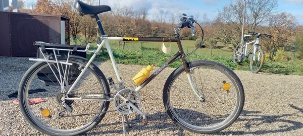 MTB Vintage originale del 1987; telaio in acciaio Columbus l/XL, cambio Shimano 3x6 non indicizzato. Originale in tutto salvo manopole, tubo sella e copertoni; però ho un copertone originale Superga ed uno Specialized sempre dell'epoca. Notevole il cavalletto svizzero a due gambe.